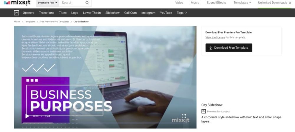 他にもテンプレートも揃っていて、試しにPremiere Proのテンプレートをダウンロードしてみると、無料にもかかわらず充分使えるクオリティでした。