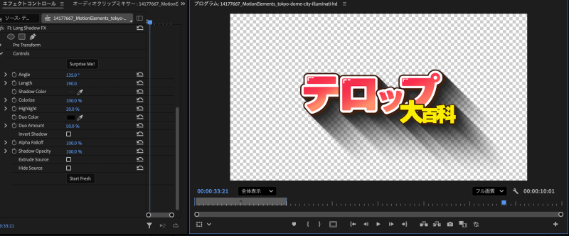 Long Shadow FXは、テキスト、ロゴ、アイコンなど、透明な背景(アルファチャンネル)を持つ素材に長く伸びる影(ロングシャドウ)を追加できるエフェクトです。