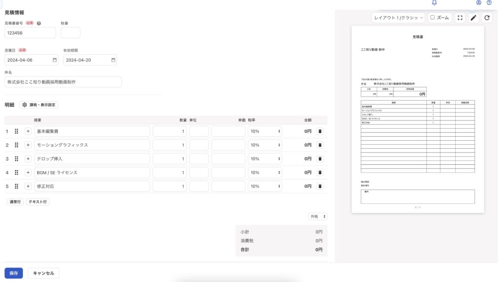 簡単に見積書を作るなら会計ソフトのFreeeがおすすめです、筆者も実際に使っていて請求書の作成や見積もりの作成もできます。