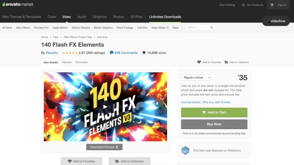 日本のテレビ番組でも時々使われているVideohiveの「140Flash FX Elements」は雷や炎といったエフェクトからポップでかっこいいトランジションがたっぷり入ったセットです。
