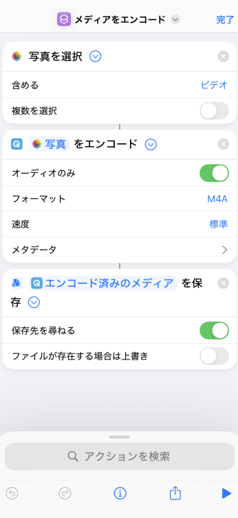 実行すると動画を選ぶ画面が開き、選んだ動画から音声だけが m4a ファイルとして書き出され、ファイルアプリに保存できます。