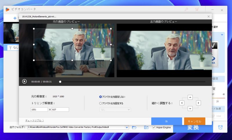 できる機能の一例、クロップ。動画の切り抜くことができます。